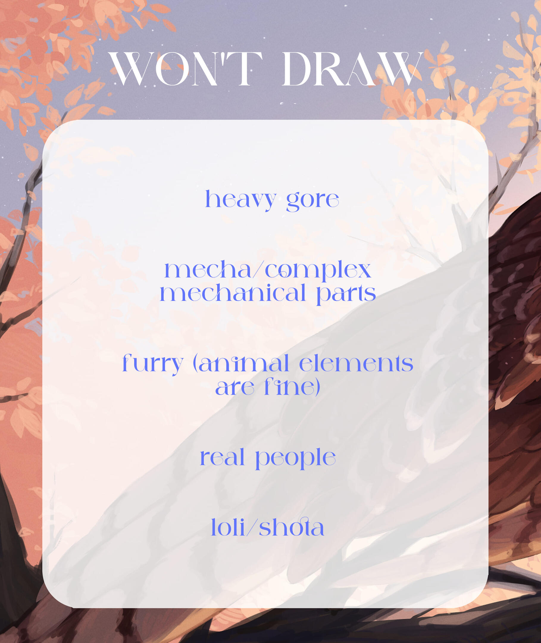 please have visual references, text only references will be additionally chargedcommissions are for personal, non-commercial use only, absolutely do not use my work for NFT/AII reserve the right to use commissioned pieces in my portfolio or post them on social media to promote my workI reserve the right to decline a commission for whatever reasonplease keep in mind that my art is constantly evolving, so the finished product might differ slightly from shown examples✦